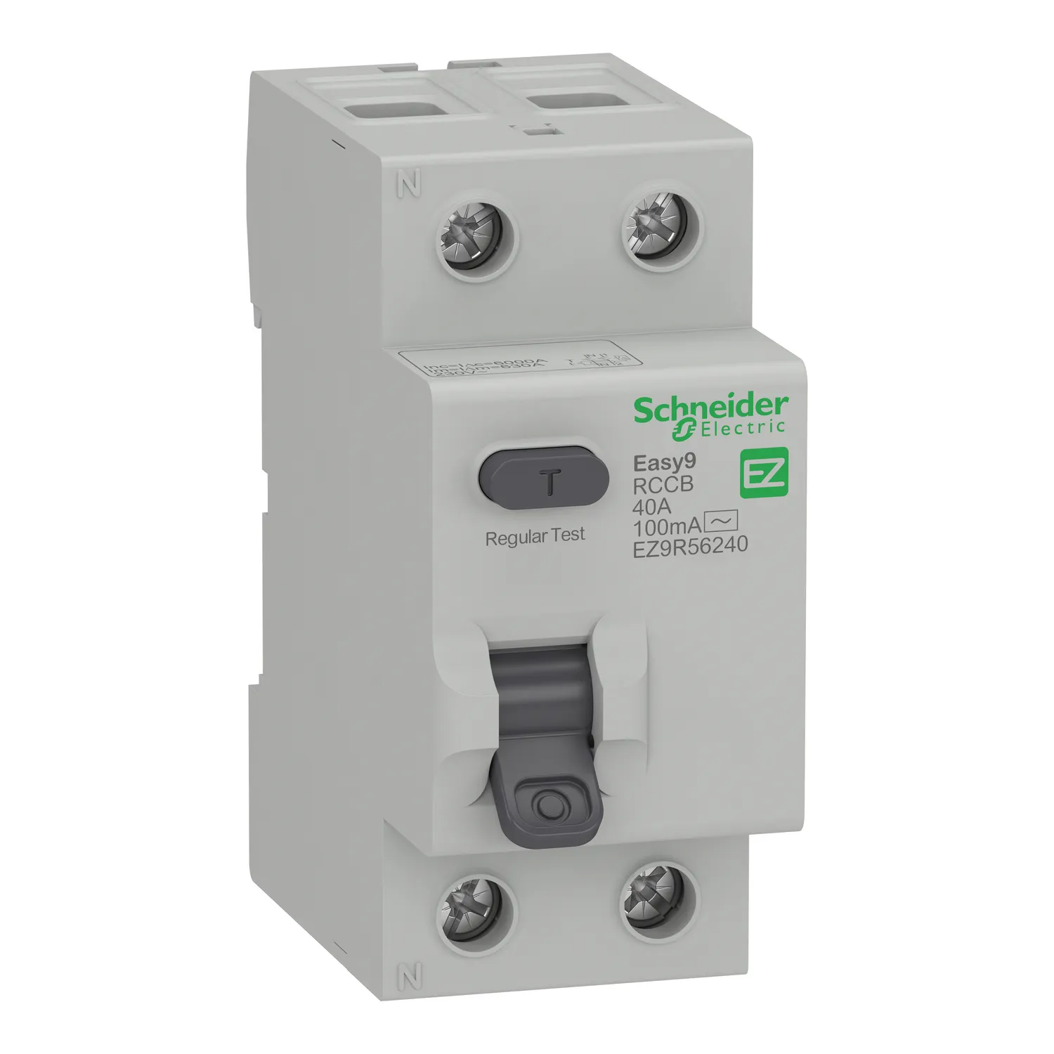 Schneider Electric EZ9R56240 Easy9 RCCB | 2 Poles 40A Rated Current | 230V AC | Easy9 Series Budget-Friendly MCB | Cost-Effective Circuit Protection | Residential Commercial Applications | DIN Rail Mount 18mm Pitch | BS EN 60898-1 IEC 60947-2 Standards | Conventional Busbar System | Tool-Free Installation | Compact Design Space-Saving | Tunnel Terminal Connections | IP20 Protection Degree | Short Circuit Overload Protection | Modern Consumer Unit Compatible | Easy Installation Maintenance | Earth Leakage Protection | Residual Current Detection | Personal Safety Device | Electric Shock Prevention | Fire Prevention | Ground Fault Protection
