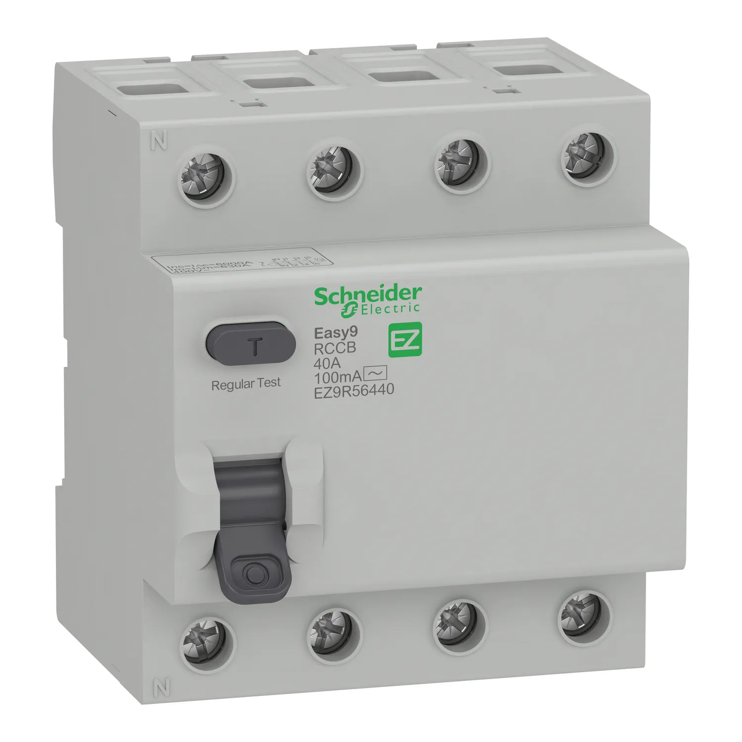 Schneider Electric EZ9R56440 Easy9 RCCB | 4 Poles 40A Rated Current | 400V AC | Easy9 Series Budget-Friendly MCB | Cost-Effective Circuit Protection | Residential Commercial Applications | DIN Rail Mount 18mm Pitch | BS EN 60898-1 IEC 60947-2 Standards | Conventional Busbar System | Tool-Free Installation | Compact Design Space-Saving | Tunnel Terminal Connections | IP20 Protection Degree | Short Circuit Overload Protection | Modern Consumer Unit Compatible | Easy Installation Maintenance | Earth Leakage Protection | Residual Current Detection | Personal Safety Device | Electric Shock Prevention | Fire Prevention | Ground Fault Protection